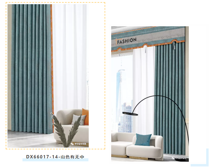 這款窗簾的主布色彩就像一幅以山光水色作為畫幅的墨畫遠景,迷迷蒙蒙,若有若無。