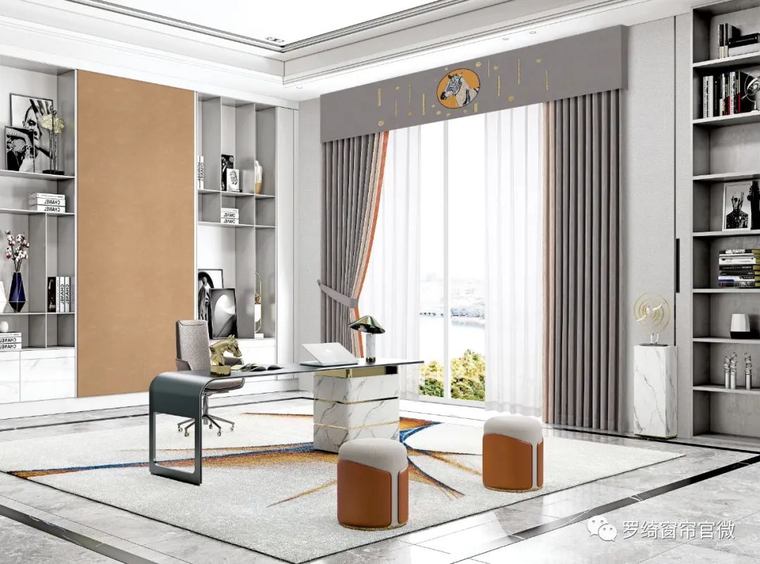 簾頭上的造型設計,采用了傳統的斑馬樣式,邊上點綴著不規則大小的金色長條圓點等,展現出了空間質感與視覺的衝擊力,營造了一種溫馨、時尚的輕奢居住環境。馬寓意著赤誠,血與火,剛烈,奔馳。